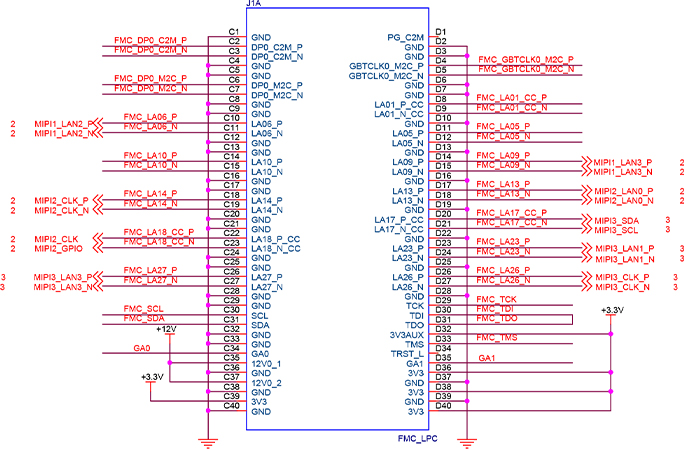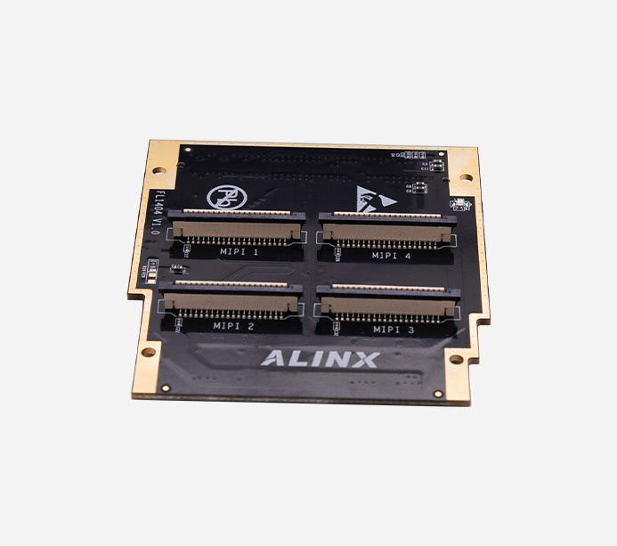 FMC 连接器上扩展 4 路 MIPI,通过 FPC 排线连接 MIPI 摄像头,或 MIPI LCD 屏。每路 MIPI 都是 LANEx4 的接口,速率高达 2.5Gbps