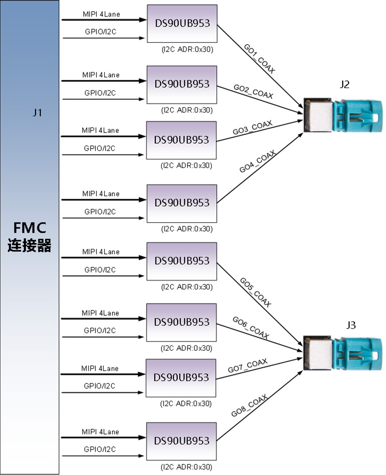 FH9530 采用 8 片 TI 的串行器芯片 DS90UB953-Q1 实现 8 路视频编码输出视频接口采用 4 合 1 的 FAKRA 车规同轴连接器