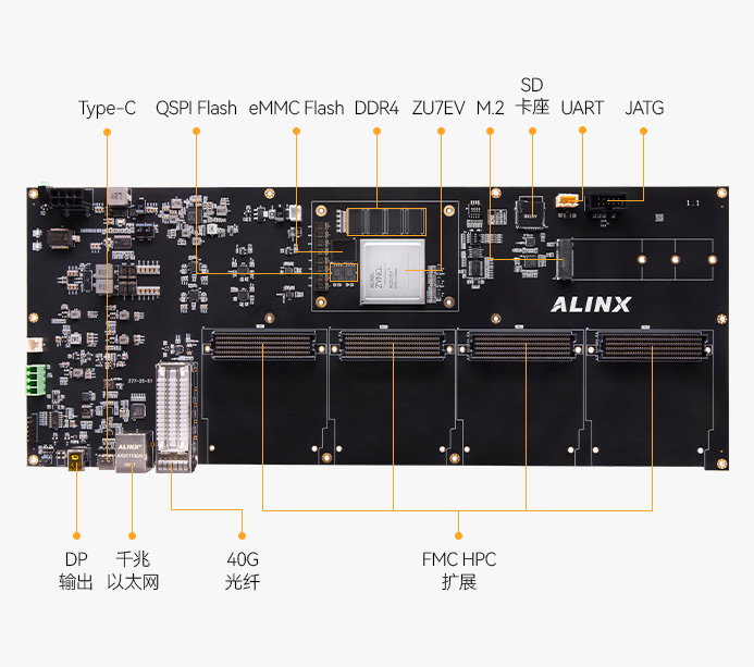 丰富高性能功能接口:4GB DDR4(PS) + 32GB eMMC FLASH + 32MB QSPI FLASH,4 路 FMC HPC、1 路 M.2 SSD 接口、1 路 Display Port 输出接口、1 路 40G QSFP+ 光纤接口、1 路千兆以太网接口、1 路 USB3.0 Type-C 接口、1 路 JTAG 接口、1 路 UART 接口、1 路 TF 卡接口。