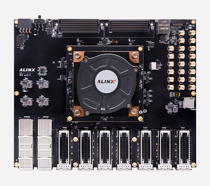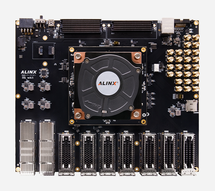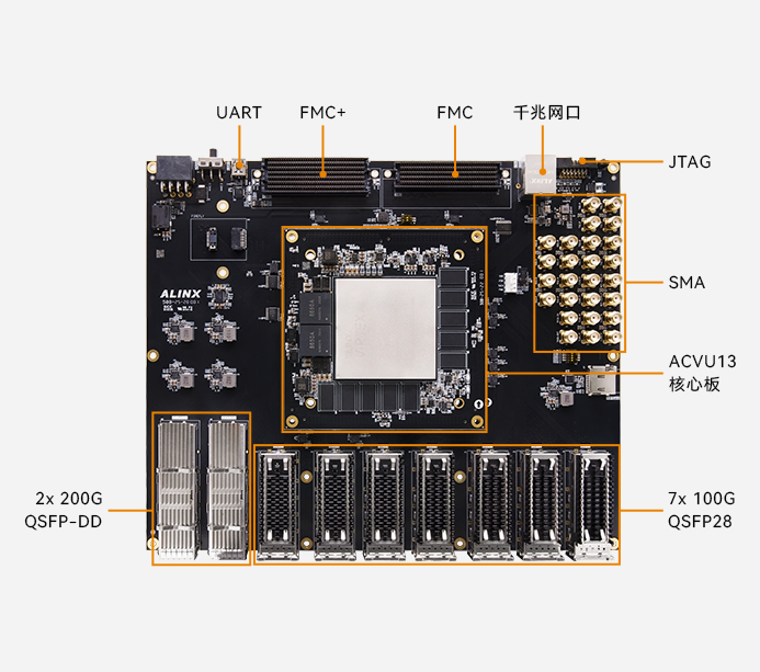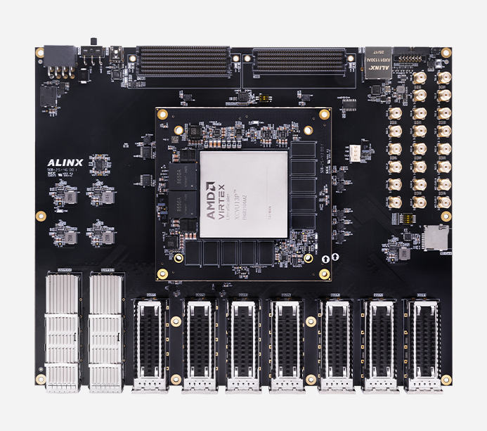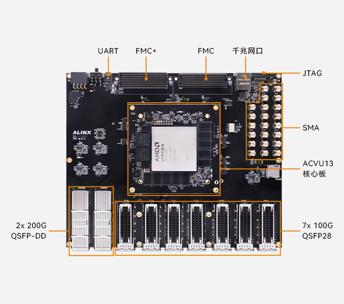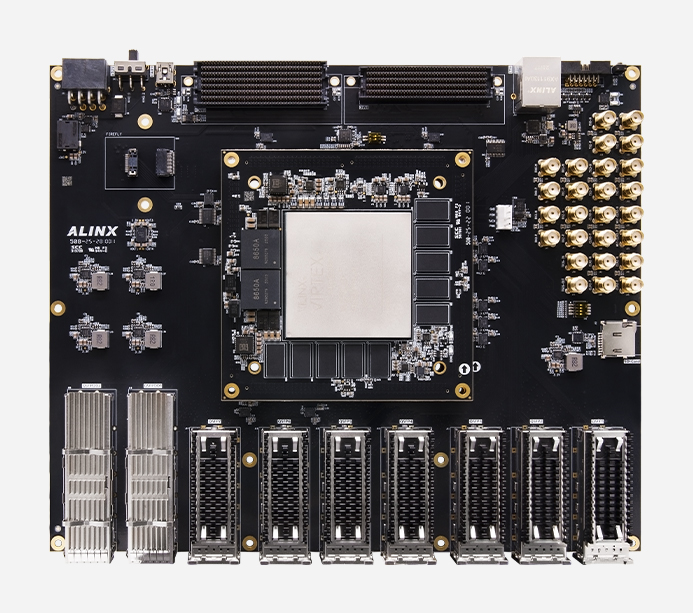 AXVU13G 开发板提供了丰富的高速网络接口(QSFP-DD/QSFP28)、扩展接口(FMC+/FMC)和调试接口(UART/JTAG)